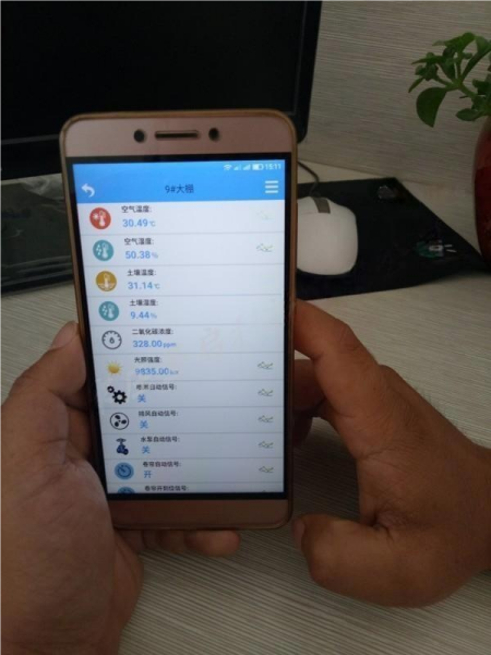 左邊是采集的參數(shù)顯示:空氣溫濕度、土壤溫濕度、二氧化碳含量、光照強(qiáng)度等,西北地區(qū)的陽光充足啊。